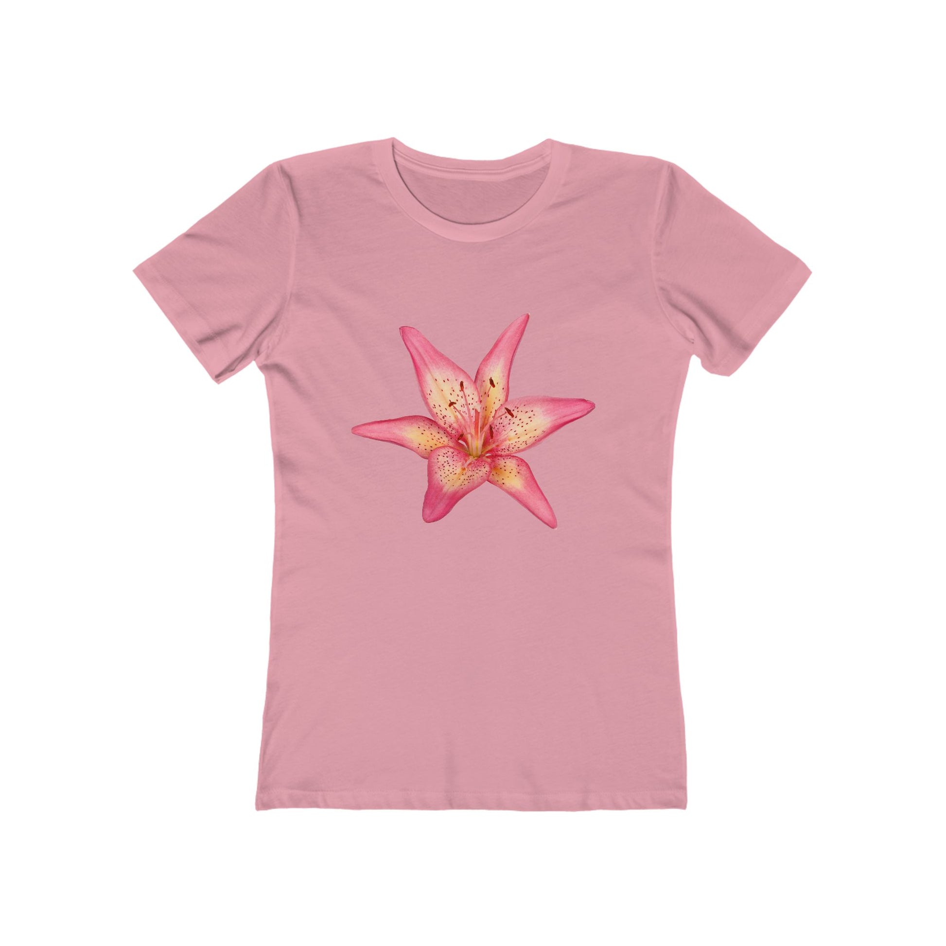 A stylish lily print tee made from high-quality fabric, featuring a slim fit and longer body length. Perfect for casual wear or lounging at home, this tee is ideal for women who appreciate comfortable yet fashionable clothing. Great for spring and summer outings or relaxing holidays.